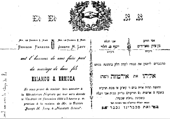 הרב אליהו פרדס בן מזל אורו ור' בן ציון נסים פרדס זצ"ל הרב הראשי לירושלים רבי אליהו פרדס – רב ופוסק, מורה ומחנך-העמיד דורות תלמידים. חבר, יו"ר ונשיא מוסדות צבוריים ותורניים שונים. כתביו בדרש ובהלכה מופיעים בכתבי עת רבים-חלקם בקובץ לזכרו-ומקובצים לדפוס. יקיר ירושלים, רבה של ירושלים וחבר מועצת הרבנות הראשית. יצא בשליחויות חינוכיות ותורניות למצרים ולבנון (בשנות השלושים) לצפון אפריקה (בכהנו כרבה של רמת-גן) אירופה ואמריקה. מיסד ונשיא קרנות 'חונן ומלוה' ו'תומכי תורה למתן הלואות לכל צר ומצוק ללא הבדל עדה או מפלגה. הונצח באתרים רבים בירושלים ובארץ: בית-ספר, בית-כנסת, יער קק"ל, בול קק"ל, תמונת דיוקנו לתפוצות, קובץ לזכרו, במות 'תורה ומדינה' בימי השנה לזכרו, המדרשה לקרוב לבבות ולאהבת ישראל בבת-ים, רחובות בירושלים, רמת-גן ובאר-שבע וגנים בבת-ים אשדוד ועוד. כזה היה האיש יחיד סגולה בדור התחיה והתקומה, אהוב לשמים ואהוב לבריות- דורש טוב לעמו ונערץ על כלל ישראל-אדם היה. נישא לאירמוזה/אליגרי בנות אסתר והראב"ד יוסף מרדכי הלוי (3) ובזיווג שני לזהרה בת יוכבד ורבי שלמה אבורביע (4). נולד בירושלים, י"ז בתמוז, תרנ"ג1893-, נלב"ע י"א ניסן, תשל"ב1972-. על בניו אמר: קח לך א'נ'ש'י'ם' ועל בנותיו: וא'ש'י'ח'ה בחקיך. בניו: מארמוזה: שרה (אלקלעי) ואברהם; מזהרה: נסים, שלמה, יוסף,אורה, יפה(שושני), מאיר וחפציבה (בן-נון). נפטר י"א בניסן תשל"ב 1972 מקום קבורתו הר הזיתים, ירושלים מרת ארמוזה פרדס בת אסתר וראב"ד הרב יוסף מרדכי הלוי זצ"ל נפטרה כ"ה כסלו תרפ"א 1920 רעייתו של הרב אליהו פרדס זצ"ל – רבה הראשי של ירושלים אמם של שרה תבל"א ואברהם זצ"ל מקום קבורתה , הר הזיתים, ירושלים ======================================================= מרת זהרה פרדס בת יוכבד והרב שלמה אבורביע זצ"ל נפטרה כ"ו ניסן תש"ד 1944 רעייתו של הרב אליהו פרדס זצ"ל – רבה הראשי של ירושלים אמם של נסים זצ"ל, שלמה זצ"ל, יוסף, אורה, יפה, מאיר וחפציבה מקום קבורתה , הר הזיתים, ירושלים ======================================================= מרת אלגרה פרדס בת אסתר וראב"ד הרב יוסף מרדכי הלוי זצ"ל נפטרה ה' באלול תשל"ב 1972 רעייתו של הרב אליהו פרדס זצ"ל – רבה הראשי של ירושלים קום קבורתה , הר הזיתים, ירושלים ____________________________________________________________ בניו נכדיו שרה (אלקלעי) יפה אבי אברהם זצ"ל אליהו, יפה, רבקה ניסים זצ"ל אליהו, אהרון, זהורית שלמה זצ"ל אליהו, זהרה, משה יוסף זוהרה, רבקה אורה יפה( שושני ) זהורית, נורית, מירב מאיר אורית, ליאת. יעל חפציבה ( בן-נון ) זוהרה, אבי ___________________________________________________________ Paredes הזמנה לחתונת אליהו וארמוזה ,הורי החתן בן ציון פארידיס