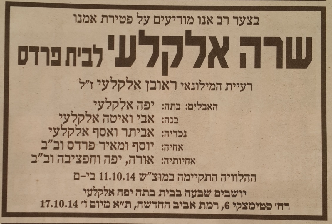 11.10.2014 אימא נשארת אימא -- גם בגיל 99 שנה. בשנתיים האחרונות עברנו עם אימא כמה בעיות בריאותיות, חלקן קשות מאוד - אך את כולן אמא צלחה ועברה בשלום ונתנה ליפה אחותי ולי, להרגיש שהיא למעשה כמעט נצחית. מה אומרים על אישה אשר ביקשה להימנע מהספדים ורק שאדאג להביא ללווייתה 10 בחורים מבית הכנסת טרנטו שבשכונת אוהל משה למקרה שלא יהיה מניין בלוויה שלה. למעשה, לאימי היו שתי בקשות עליהן חזרה יותר מפעם אחת: 1) שלא תישאר חייבת לאף אחד אגורה. 2) שיהיה טקס לוויה פשוט. שתי בקשות אלו ייצגו למעשה את אישיותה של אימא והציגו שתי תכונות נאצלות שהיו חבויות בה : יושרה - החינוך לומר את האמת, להיות ישר דרך ולא להישאר חייבת לאף אדם וצניעות - אימי מעולם לא התרשמה מטקסים ומסיבות שנועדו לפאר ולרומם אנשים. גם הייחוס המשפחתי שלה כבת לרב הראשי הספרדי של ירושלים , הרב אליהו פרדס ז״ל והנישואים לאבי ראובן אלקלעי ז״ל אשר נחשב בזמנו לאישיות מוכרת - לא גרמו לה להתנשא מעולם. אבל, היו לאימי גם תכונות אופי טובות נוספות כמו: חוש הומור- כאשר היו שואלים אותה מה שלומך? תמיד ענתה בחיוך: ״כמו זקנה״ וכאשר היינו מתקנים אותה בכמה וכמה נושאים ומסבירים כי יתכן וקצת התבלבלה אז מיד היא היתה שואלת- קצת?? ומייד מציינת אני מאוד מאוד מבולבלת. נדיבות - תמיד הייתה נכונה לעזור גם באופן כלכלי לבני משפחתה ולסובבים אותה. אמא תמיד הקפידה לדבר בעברית רהוטה דבר שאי אפשר היה להתעלם ממנו ובכל מקום בו אנשים פגשו את אימי התרשמותם הראשונה היתה: ״וואו איזה שפה עברית תקנית ומדויקת מדברת אמך״. ולא בכדי התחנות שאימא עברה בלימוד והכרת השפה העברית החלו כבר בילדות בבית הספר למל אצל אדון מטות המורה הנערץ, עבור דרך אחיה הצעיר אברהם זכרונו לברכה שהיה מורה לעברית מצטיין וכמובן תמיכה ועזרה לאבי זכרונו לברכה בפועלו הבלשני בקידום השפה העברית והקמת מפעל חייו - חיבור המילונים עברי-אנגלי אנגלי- עברי. איזה כבוד אימא הבאת למשפחה שלא נפלת בהרבה מאבא באהבה ובידיעת השפה העברית. הכרת תודה ואהבה - אימא שנתייתמה לה בגיל צעיר תמיד ידעה להזכיר ולהוקיר את הדודה בת שבע, אחות אביה, אשר למעשה גידלה אותה כמו אמה שלה. פעמים רבות יצא לנו לדבר על "יום הפקודה" כלומר היום בו תעזוב אותנו בדרכה האחרונה ותמיד אימא להרגיע אותנו, הייתה מצטטת את קהלת: ״דור הולך ודור בא״ - אך הפוך מכוונתו המלנכולית של קהלת שראה בעין פסימית את המחזוריות בעולם , אמא תמיד הסתכלה באופטימיות לגבי הדור הצעיר כאשר עיקר גאוותה הייתה בנכדים אביתר ואסף שאותם אהבה ללא קץ. ואימא גם העניקה אהבה למשפחתה הקרובה: ליפה אחותי לי לאחיה אברהם ז"ל, ניסים ז"ל שלמה ז"ל יבדלו לחיים ארוכים יוסף ומאיר, ואחיותיה יפה, אורה וחפצי להם העניקה אהבה אמיתית וללא פשרות. ולסיום אי אפשר שלא להזכיר את חוכמת החיים שאימא צברה במהלך שנות גילה והערותיה הקצרות, אך הקולעות, למצבים השונים שנתקלה בהם כאשר אחד המקורות לאמרות השנונות הייתה סבתה מצד אביה המנוח, מזל אורו, אשר לטענת אימא הייתה אחת הנשים החכמות ביותר שפגשה . את האהבה לנכדייך אביתר ואסף הדגמת במשפט המפורסם בשפת הלדינו של סבתך מזל אורו ״איזוס דה מזיזוס סון לה דוס דה מיזיזוס״ ותרגמת מיד לעברית: ״ הילדים של הילדים שלי הם פעמיים הילדים שלי״. והנה אימא ,מבלי לרצות לתת הספד, התחלנו את הזיכרון בבית כנסת טרנטו שבשכונת אוהל משה, השכונה הספרדית עליה ביסס יצחק נבון את המחזה שלו ״בוסתן ספרדי״ וסיימנו במשפט משפת הלדינו שכה אהבת. נשאר לנו לקוות כי בדרכך האחרונה תוכלי לפגוש את בני משפחתך שהלכו לפנייך ואת בעלך ראובן שאליו התגעגעת כל יום. אנו, המשפחה שנשארה כאן , נזכור ונזכיר אותך תמיד . אמא - יהי זכרך ברוך! ****************************************************************** ****************************************************************** אתר האינטרנט לזכר ראובן אלקלעי בן רחל ואברהם אלקלעי זצ"ל .בלשן , מחבר מילונים עברי/אנגלית , סופר , עורך שנתון הממשלה נפטר ב' בשבט תשל"ו 1976 .היה נשוי לשרה 
